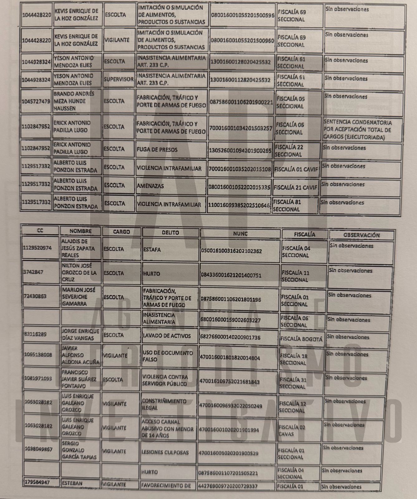 De otro lado, e indagando en anotaciones y antecedentes de escoltas, vigilantes y supervisores de Atenas, está el caso de Erick Antonio Padilla Lugo, a quien la Fiscalía le abrió tres noticias criminales: una por fuga de presos, pero esta se cerró por atipicidad de la conducta; otra por violencia intrafamiliar; y una más por la cual fue condenado el 13 de junio de 2016 a 54 meses de prisión como autor del delito de fabricación, tráfico o porte de armas de fuego.