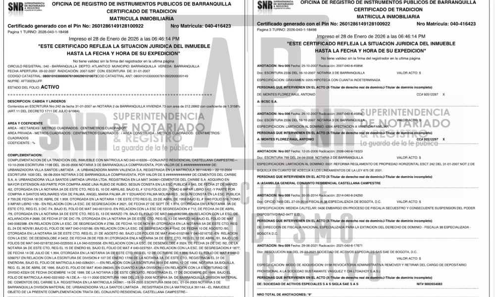 Dos años después, mediante escritura 2336 del 16 de octubre de 2017 de la Notaría Tercera de Barranquilla, se inscribió en el respectivo folio de matrícula inmobiliaria 049-416XXX la anotación número cuatro, en la que se consignó la compraventa de un bien inmueble ubicado en la calle 104 # 51 B-104, casa 73.